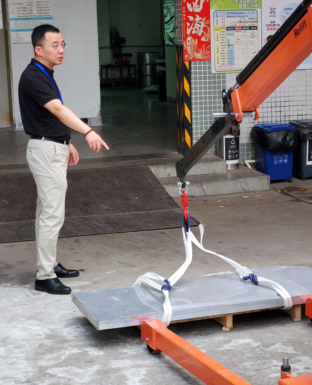 在培训开始前,刘师傅提前准备好了几块钢板,并使用绑绳和挂钩将钢板固定,保证后续的吊机操作在安全中进行。